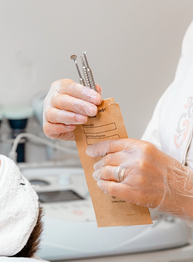 Tous les outils de travail sont stérilisés et désinfectés. Les instruments sont ouverts de leurs emballages spéciaux en kraft devant vous.